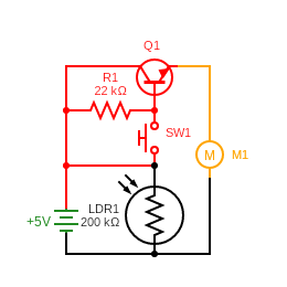 Deneme 1: Işığa bağlı direnç [LDR1], pozitiften DC motorun [M1] anotuna bağlandı; motorun katodu ise negatife bağlandı. Bu durumda M1, ışık yüksek iken çalıştı; buunun tercih edilmez olduğu anlaşıldı.