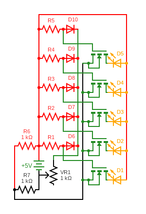 Deneme 8: R1-5 ile VR1 arasında, katodları R1-5e bakıcak şekilde birer diyot [D6-10] konuldu. Bu devre hala istenilen şekilde çalışmadı.